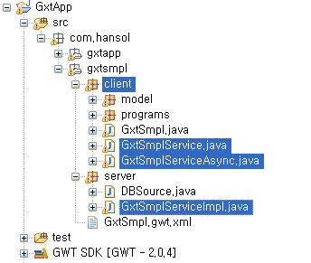 생성하였다. 이 Service는 com.hansol.gxtsmpl패키지내에서 com.hansol.gxtsmpl.client아래 GxtSmplService.java,