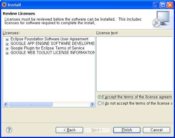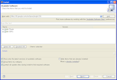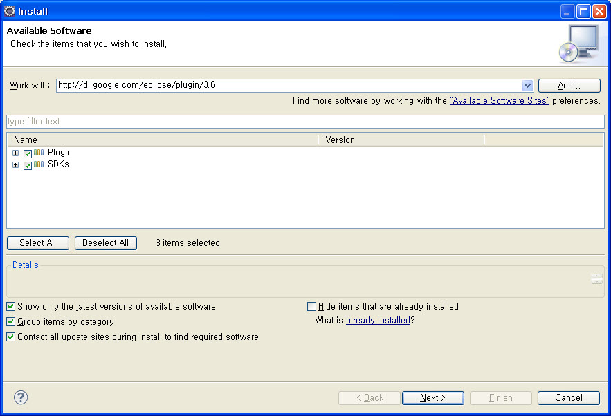 http://dl.google.com/eclipse/plugin/3.6 를 입력하고