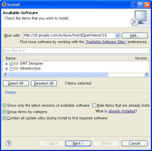 http://dl.google.com/eclipse/inst/d2gwt/latest/3.6 를
